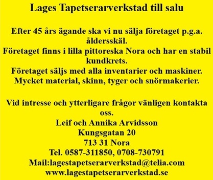 Åren går och efter att Leif arbetat som tapetserare i 55 år och haft företaget i 45 år har vi nu, efter långt övervägande, tagit beslutet att sälja våran tapetserarverkstad.